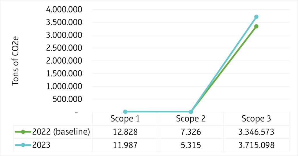 Overall, our total corporate carbon footprint increased from 3,366,727 tons of CO2e in 2022 to 3,732,410 tons of CO2e in 2023, an increase of 10.86 %. This is mainly due to higher purchases of goods and services, expanded transportation activities, and energy consumption. Despite this increase, the contribution of each scope to our overall carbon footprint remained relatively stable in 2023.