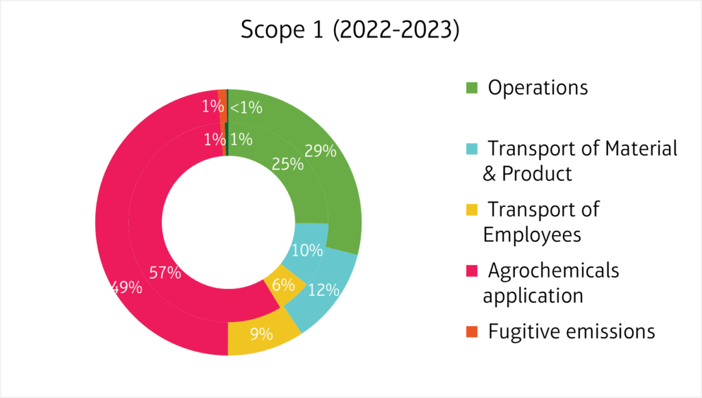 As previously described, scope 1 emissions made up 0.4 % of our total emissions in 2022 and 0.3 % in 2023. This corresponds to 12,828 tons of CO2e from our direct activities in 2022. Out of these, 97 % were attributed to the agrochemicals used on our farms. In 2023, our direct emissions decreased to 11,987 tons of CO2e. This was partly due to a 20.77 % reduction in emissions from agrochemicals, contributing to an overall 6.56 % drop in scope 1 emissions. During this period, fuel consumption for operations rose by 7 % while emissions from transport fuel fell by 5 %.