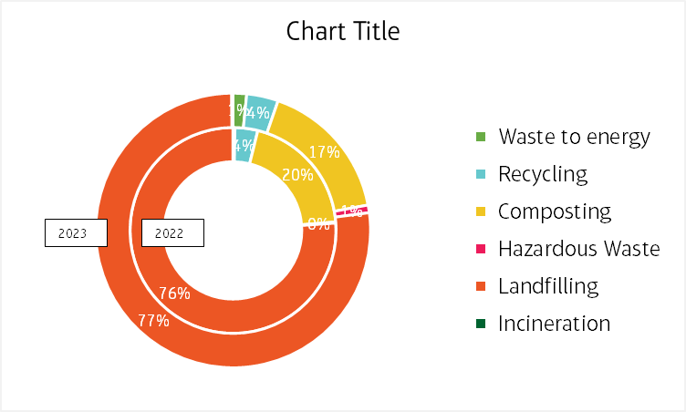 In 2022, we generated 9.6 thousand tons of waste. Of this total, 76 % was landfilled, 20 % was composted, and 4 % was recycled. In 2023, our overall waste quantity remained relatively stable, with minimal changes in waste management practices. However, we increased the portion of waste diverted to energy recovery.